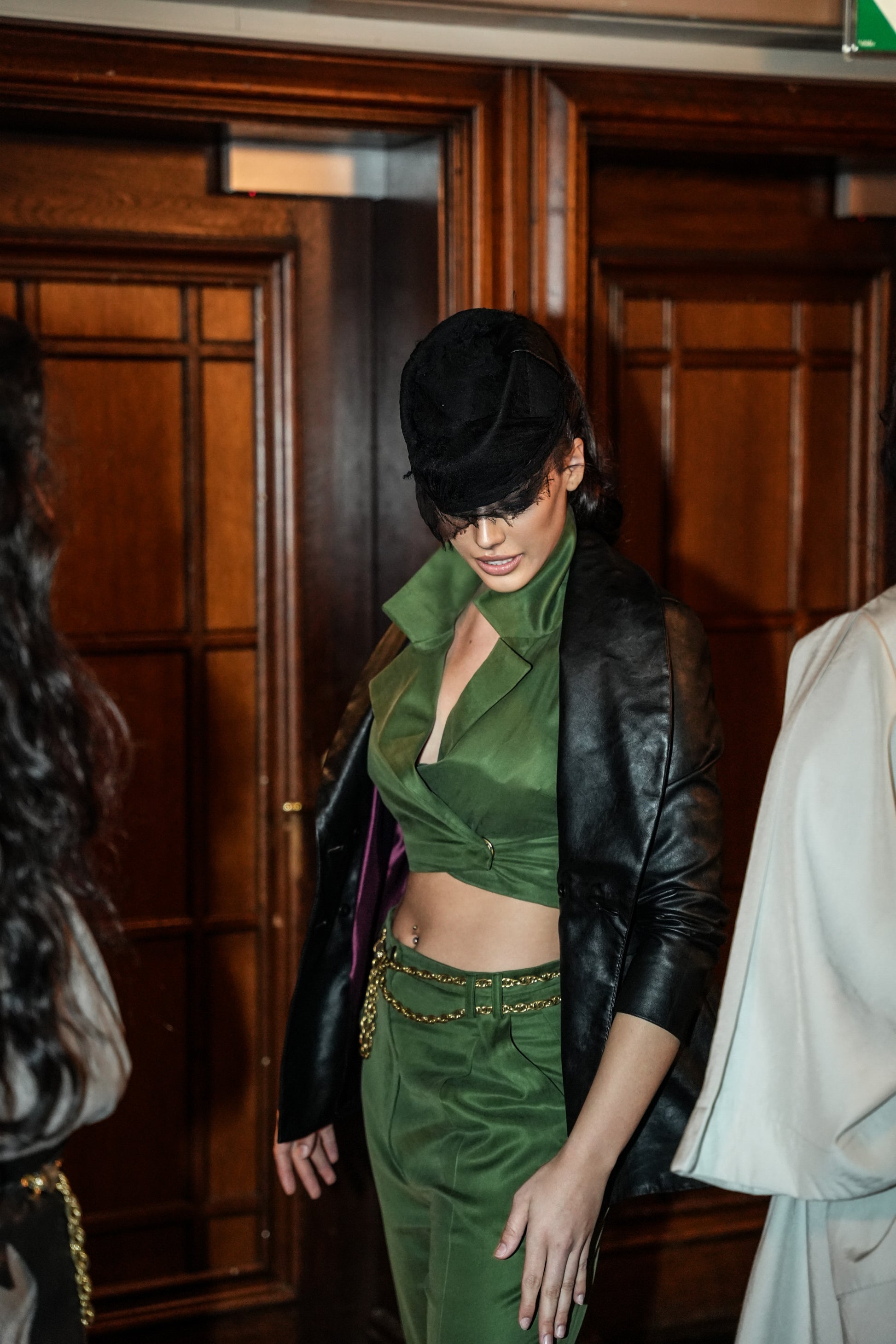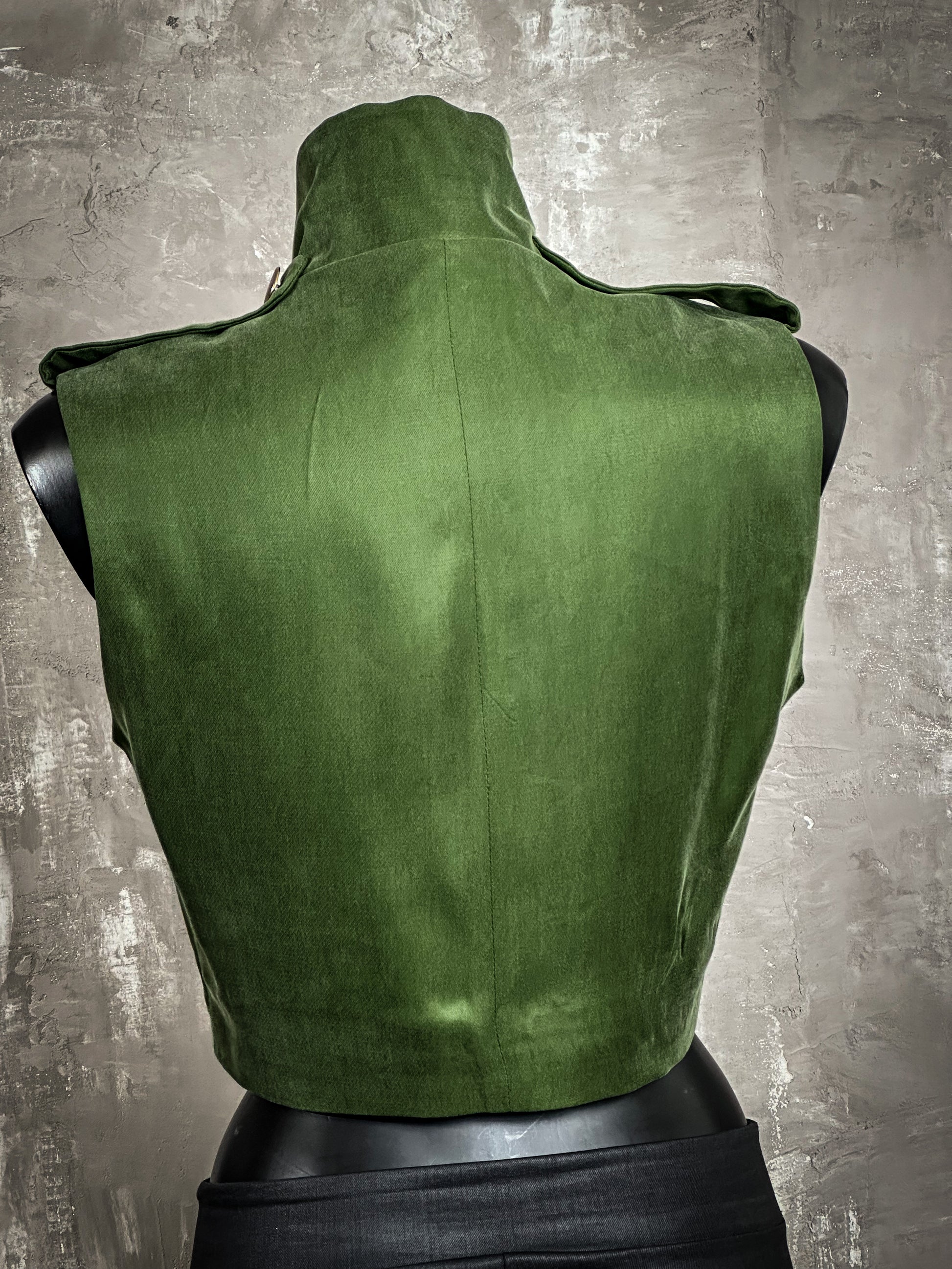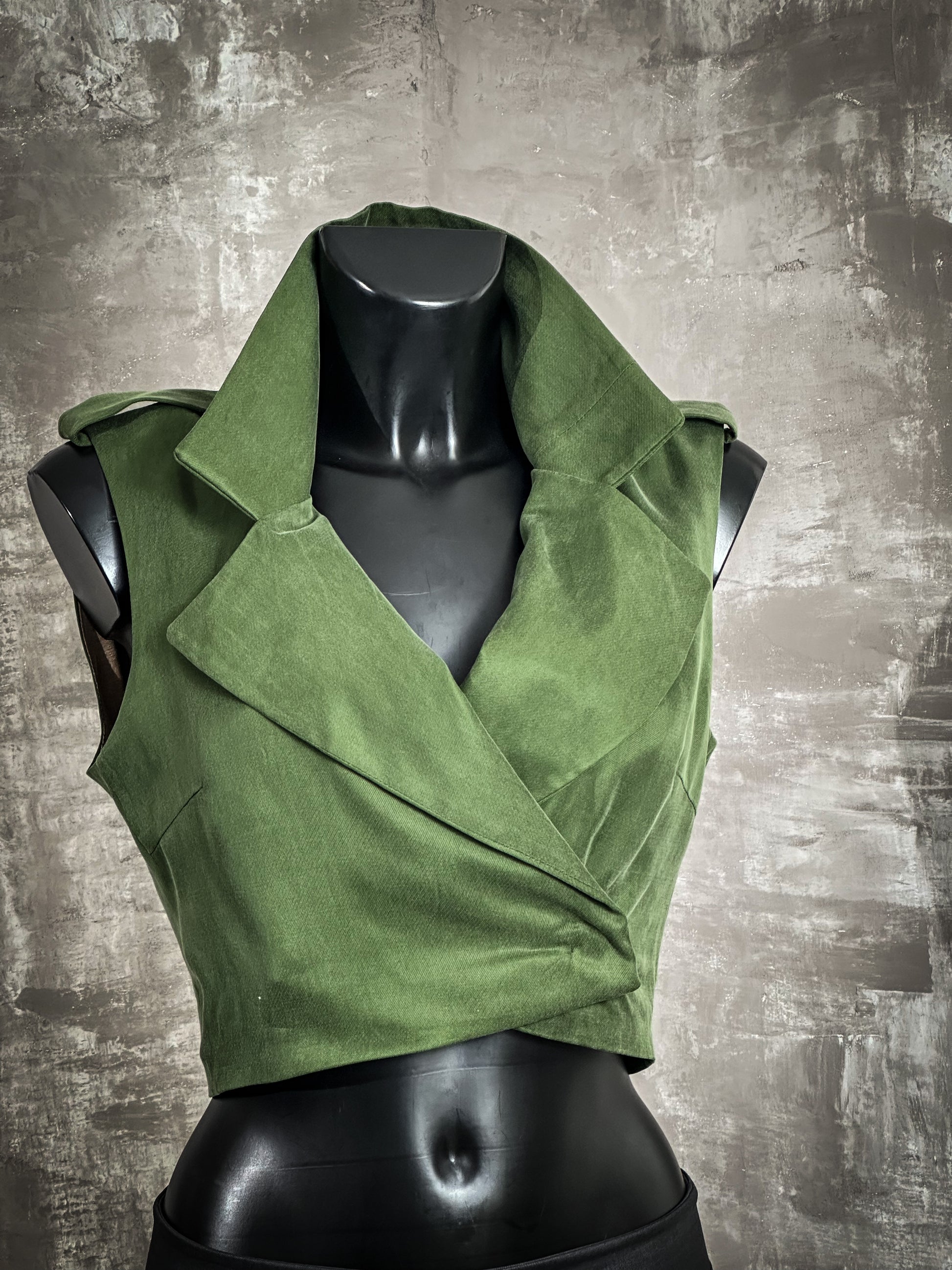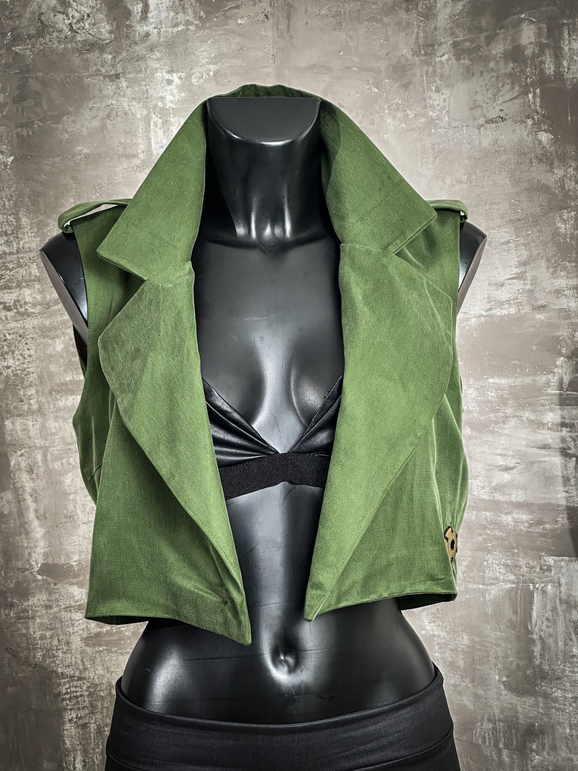 Die Silhouette ist feminin und tailliert, die Weste endet auf Taillenhöhe und wird elegant, aber körpernah getragen. Die Vorderseite ist überlappend gearbeitet und betont durch präzise Nähte und klare Linienführung. Auf eine klassische Knopfleiste wird verzichtet – der Look wirkt dadurch besonders puristisch und modern.