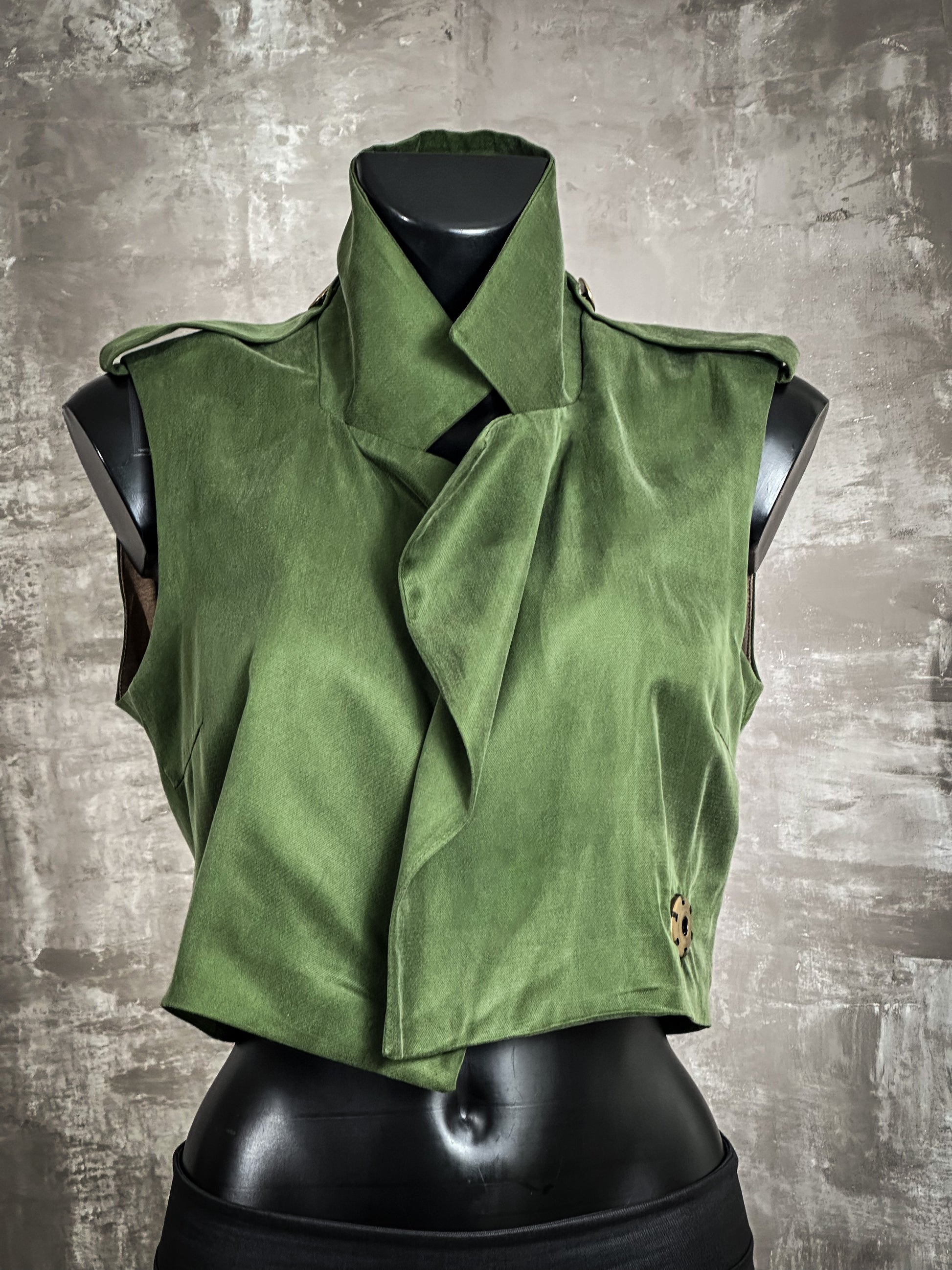 Gefertigt aus einem hochwertigen, strukturierten Stoff in frischem Olivgrün, der angenehm leicht und gleichzeitig formstabil ist. Ideal für warme Tage oder als Statement-Layer über Shirts und Blusen.