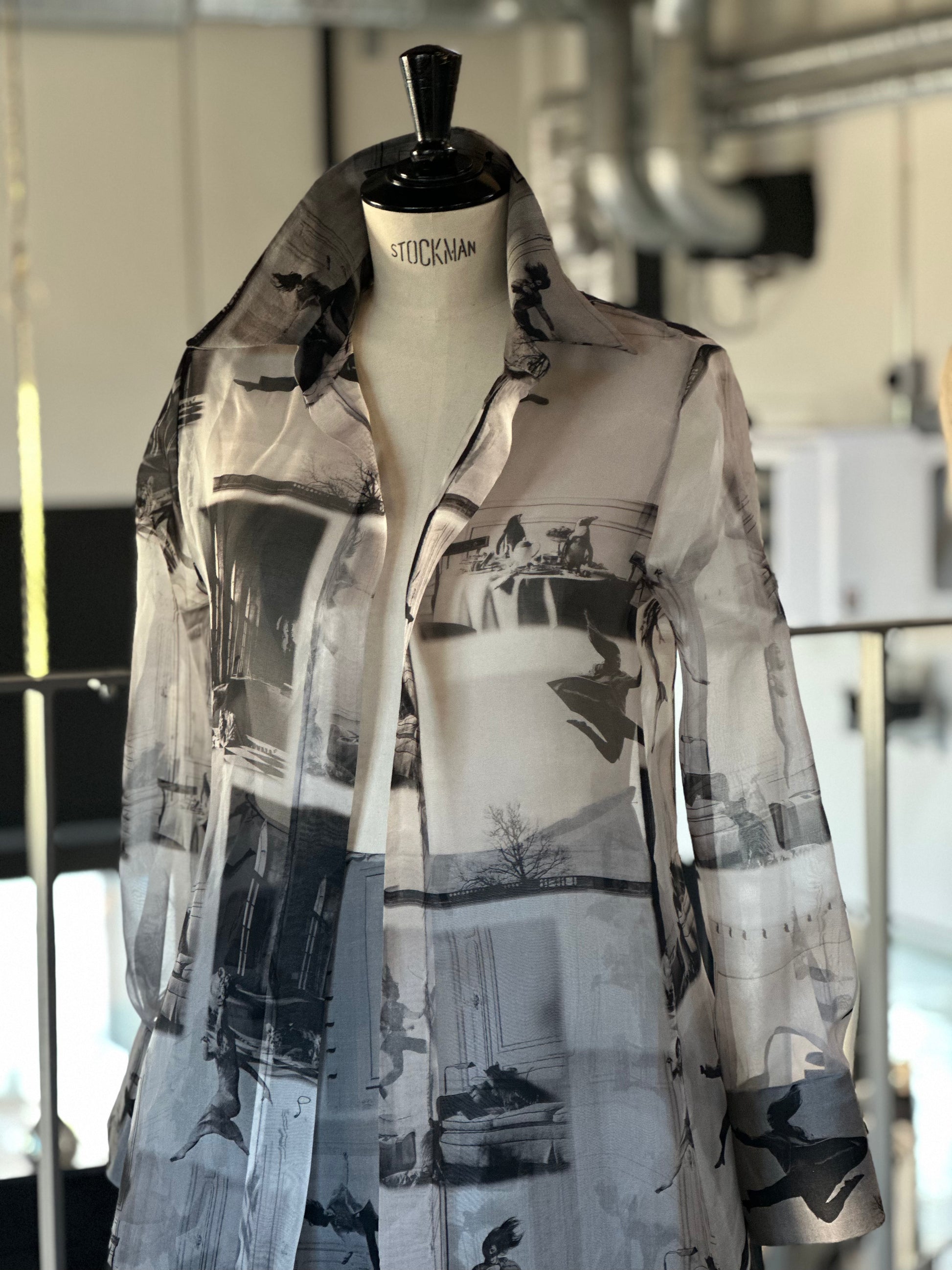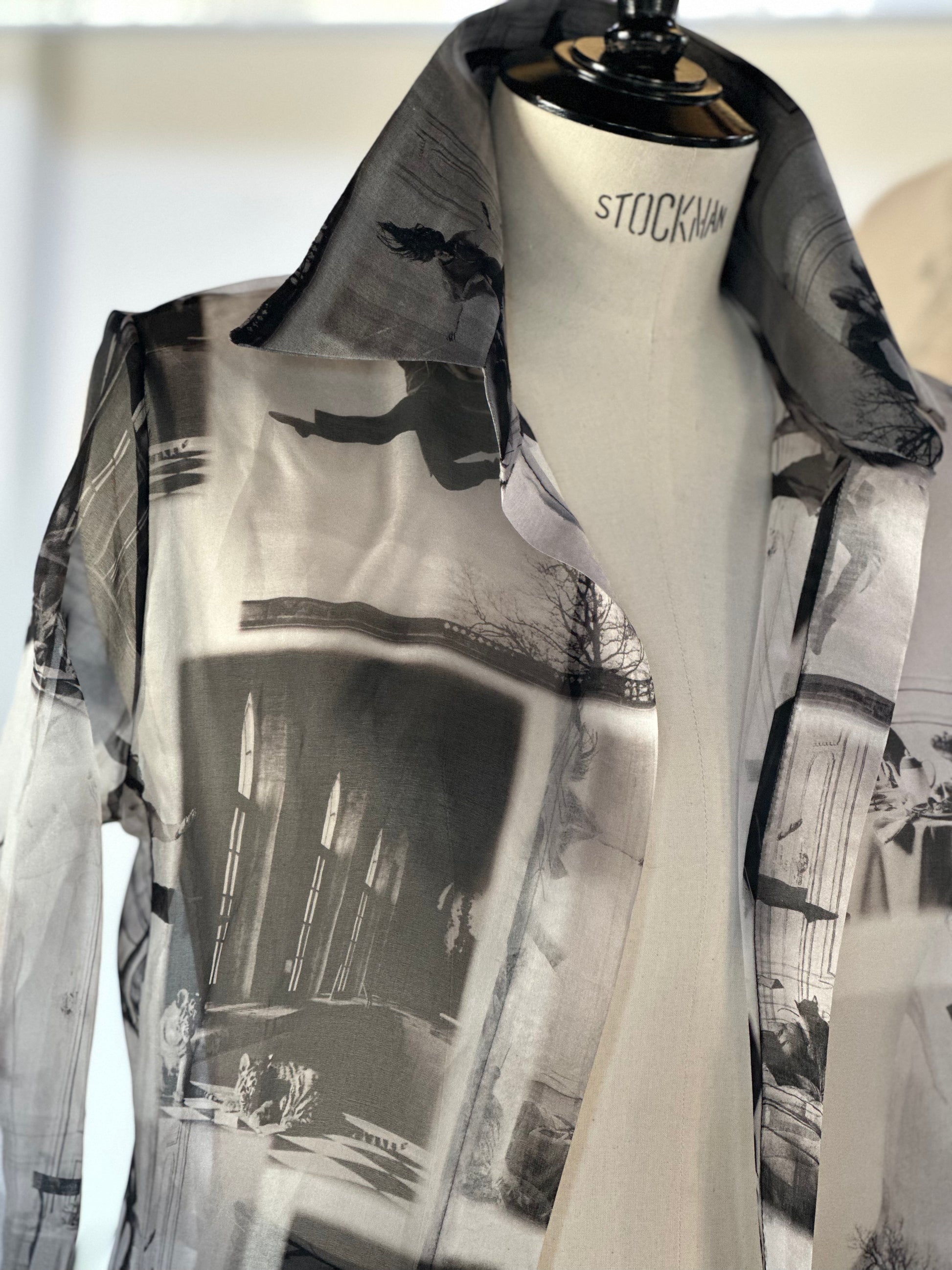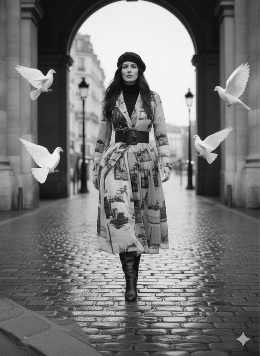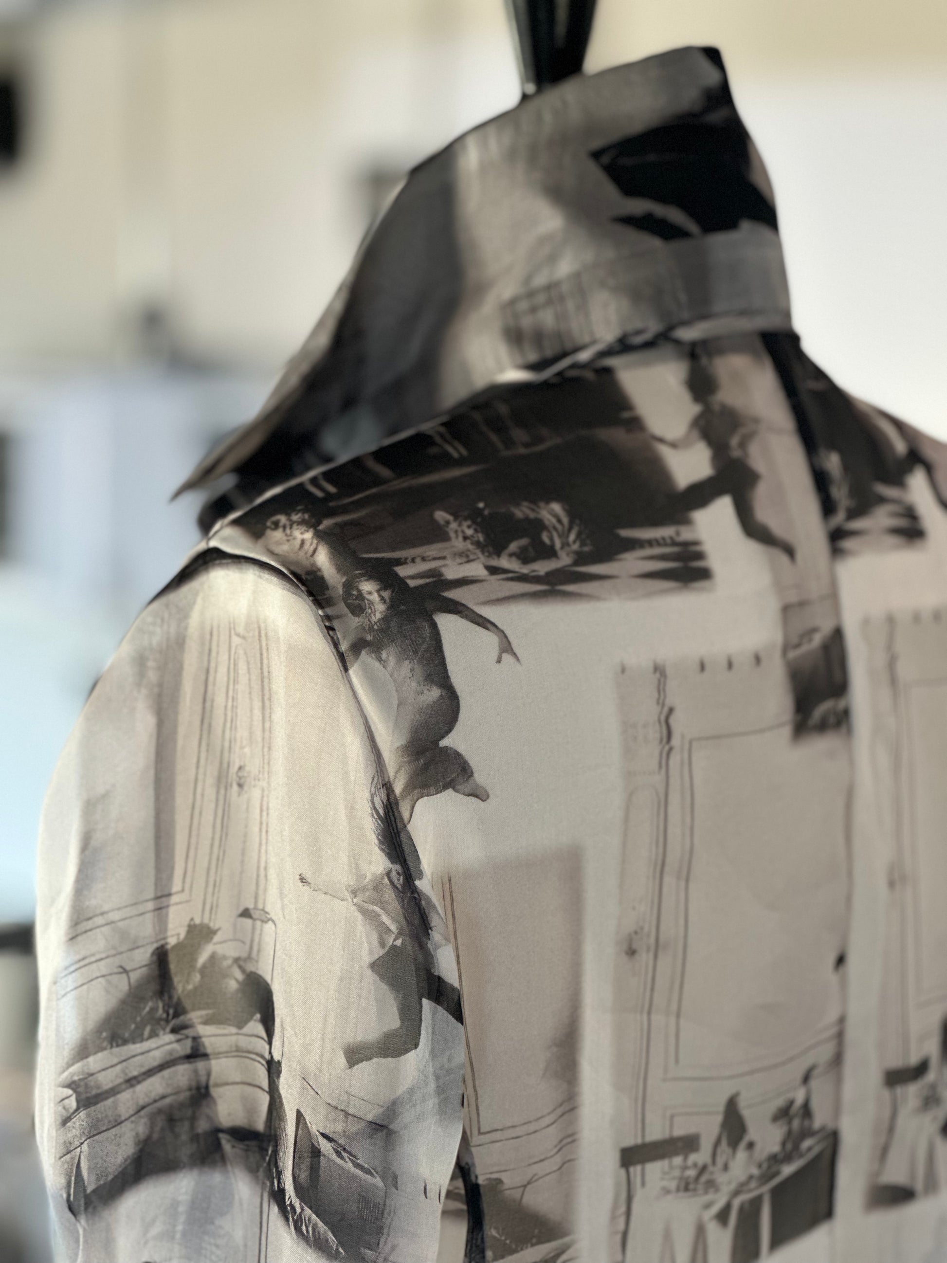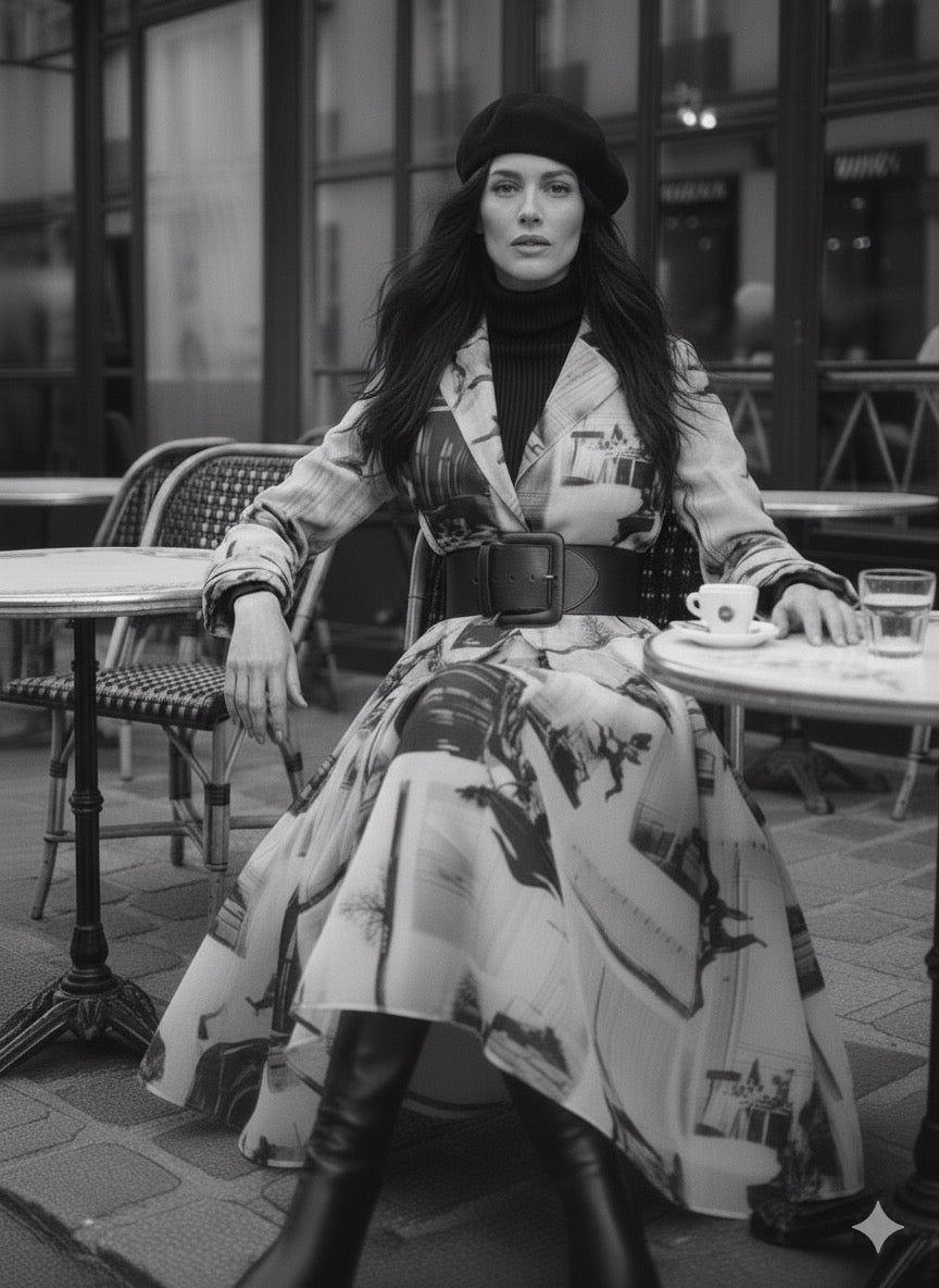 Der Mantel Paris fängt die Essenz der Modehauptstadt ein: kunstvoller Print auf feinem, halbtransparentem Organza, kombiniert mit Reverskragen und Taillengürtel. Ein Mantel, der wie ein architektonisches Kunstwerk wirkt – leicht, modern und voller Charisma.